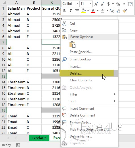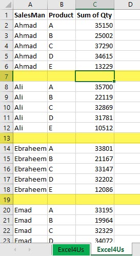 في كثير من الاحيان نتعامل مع جداول تحتوي أسطر فارغة و هذه الأسطر تسبب كثير من المشاكل و الإزعاجات عن استخدام الإكسيل و لذلك نقوم بحذفها, فلو كان لدينا الجدول التالي :
